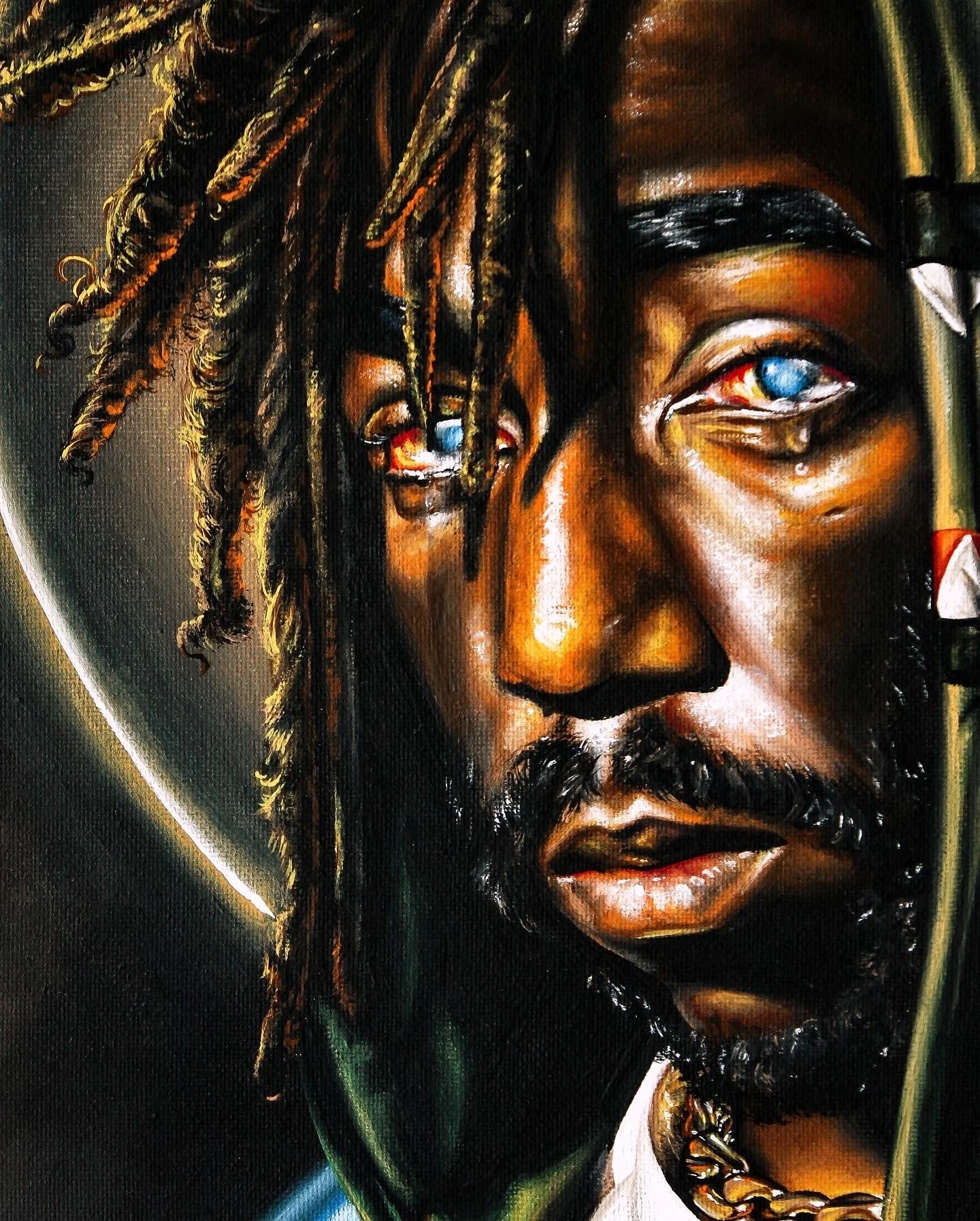 A strong influence in his work comes from the early Renaissance period due to his time spent studying art history and theory in Italy. He aims to combine the compositions and techniques from historic European paintings with figures and symbolism rooted in contemporary Black culture.